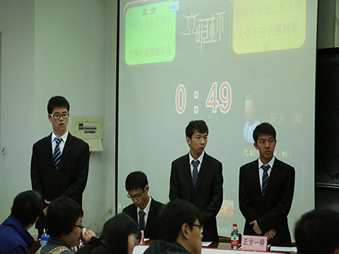 10月19日晚,文明杯辩论赛初赛于综一160顺利举行,正方物理与光电工程学院就题目“大学应不应该强制军训”战胜了反方材料科学与工程学院。人文学部老师赵大千、中软人事部经理张严、东财辩手王浩楠、马院老师马轶伦、关巍五位评委出席。